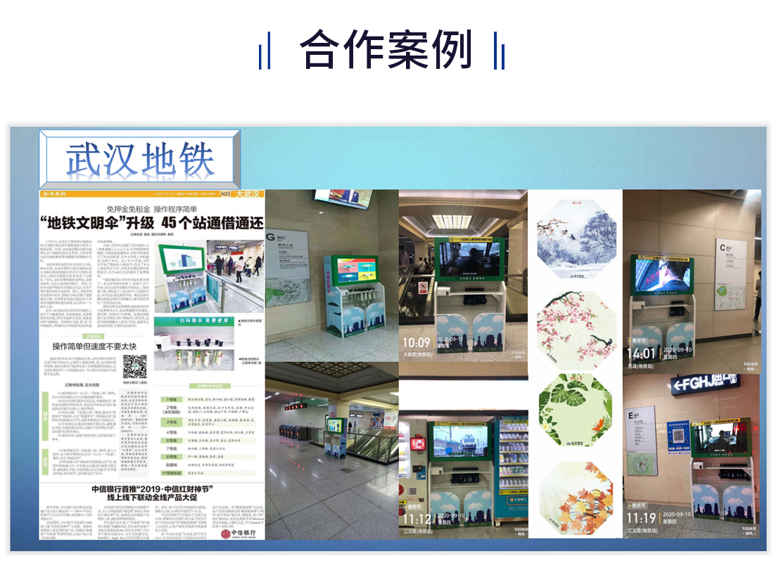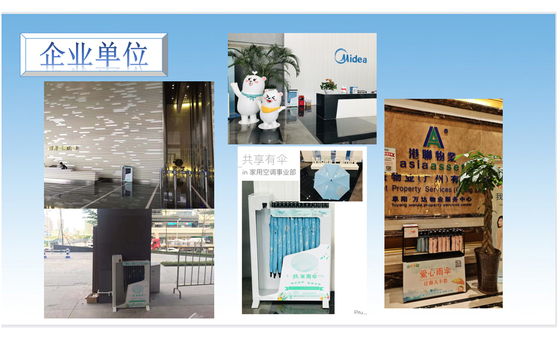 共享雨傘使用場景:酒店、地鐵、學校、機場、景區、銀行、咖啡廳、火車站、電影院、商鋪等。